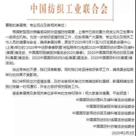 2020年中紡聯春季聯展將延期舉辦,原定于3月11-13日在國家會展中心(上海)舉辦的。