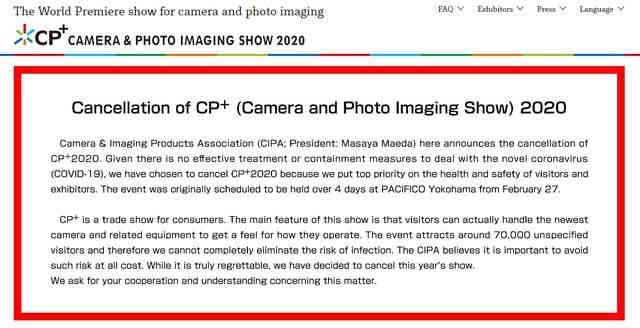 原計劃于2月27日-3月1日在日本橫濱太平洋橫濱展覽中心舉辦的日本國際攝影器材與影像博覽會CP+ 2020已與官網宣布取消。